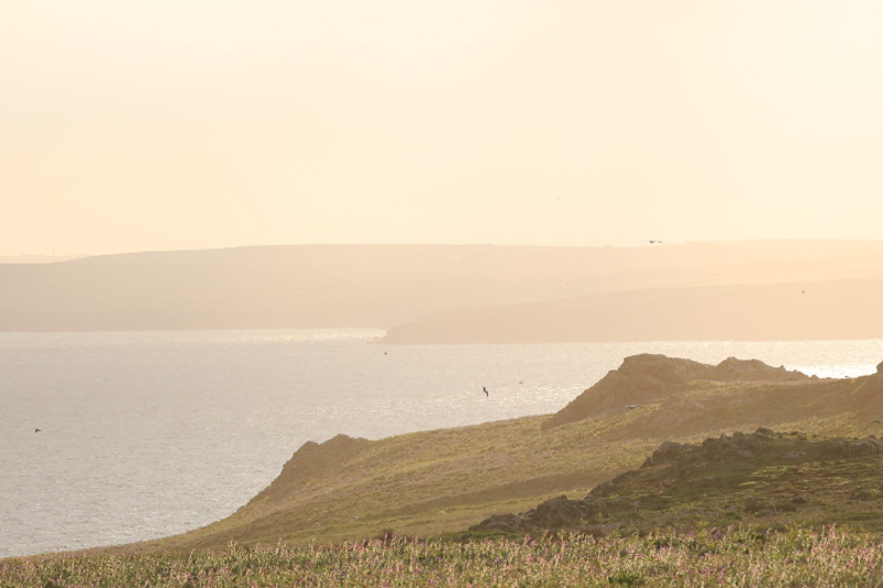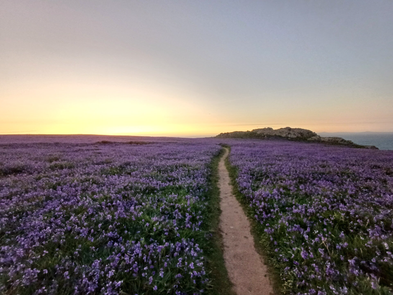In de middag hebben we rustig aan gedaan. Boekje gelezen, filmpje gekeken en een warme kop thee gedronken. In de avond zijn we naar een ander punt op het eiland gegaan om de papegaaiduikers weer te fotograferen. De plek was aan de noordkant van het eiland en laat het nu net noordenwind zijn, niet ideaal maar je moet er wat voor over hebben. Het zonnetje scheen en na ruim een uur wachten kwamen de papegaaiduikers. Met het reflecterende zonlicht op het water hebben we een paar mooie foto's kunnen maken van de puffins. Gelukkig waren we warm aangekleed en (ook best fijn) zijn we niet van de kliffen gewaaid. Op de terugweg liepen we door het grote veld met boshyacinten, met de ondergaande zon op de achtergrond was dit het zoveelste cadeautje deze week. Wat een feest om de avond zo af te sluiten!